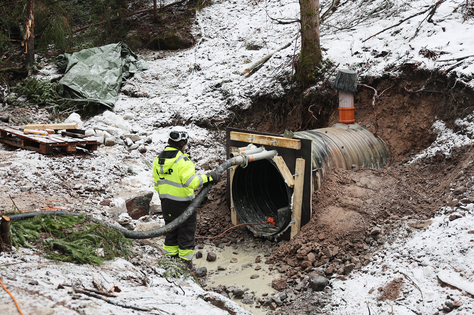 Kalliopurontien alittava vanha rumpu kunnostettiin ja hoidimme yhdessä pumppausurakoitsijansa kanssa painevalutyön. Vanhan ja uuden putken väliin jäävä tyhjä tila valettiin betonilla, jotta rummusta tulisi kestävä. Jotta koko 34 metrin pituisen putken ympärille saatiin betonivaippa, oli mitattava tarkkaan, että betonivaippa tuli varmasti täyteen.